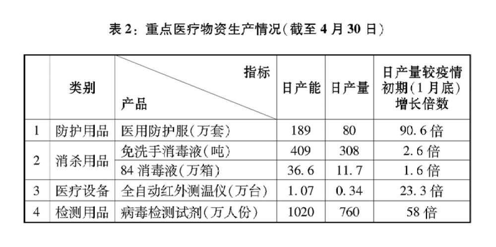 大力加强医疗物资生产供应和医疗支持服务。疫情防控阻击战,也是后勤保障战。疫情初期,武汉市医疗防护物资极度短缺,为了节省防护用品、争分夺秒抢救病患,一线医护人员克服困难,最大限度地延长防护用品使用时间。为尽快解决医疗资源短缺和病患急剧增多的突出矛盾,中国充分发挥制造业门类全、韧性强和产业链完整配套的优势,克服春节假期停工减产等不利因素,开足马力,深挖潜力,全力保障上下游原料供应和物流运输,保证疫情防控物资的大规模生产与配送。医疗企业克服工人返岗不足等困难,以最快速度恢复医疗用品生产,最大限度扩大产能。其他行业企业迅速调整转产,生产口罩、防护服、消毒液、测温仪等防疫物资,有效扩大了疫情防控物资的生产供应。快速启动防控医疗物资应急审批程序,全面加强质量安全监管,确保以最快的速度批准上市、促产保供,截至5月31日,共应急批准17个药物和疫苗的19件临床试验申请,附条件批准2个疫情防控用药上市。在各方共同努力下,医用物资产能不断提升,医用物资保供实现从“紧缺”到“紧平衡”“动态平衡”“动态足额供应”的跨越式提升(表2)。2月初,医用非n95口罩、医用n95口罩日产量分别为586万只、13万只,到4月底分别超过2亿只、500万只。畅通供应链条和物流渠道,建立联保联供协作机制,源源不断地把全国支援物资运送到疫情防控重点地区。
